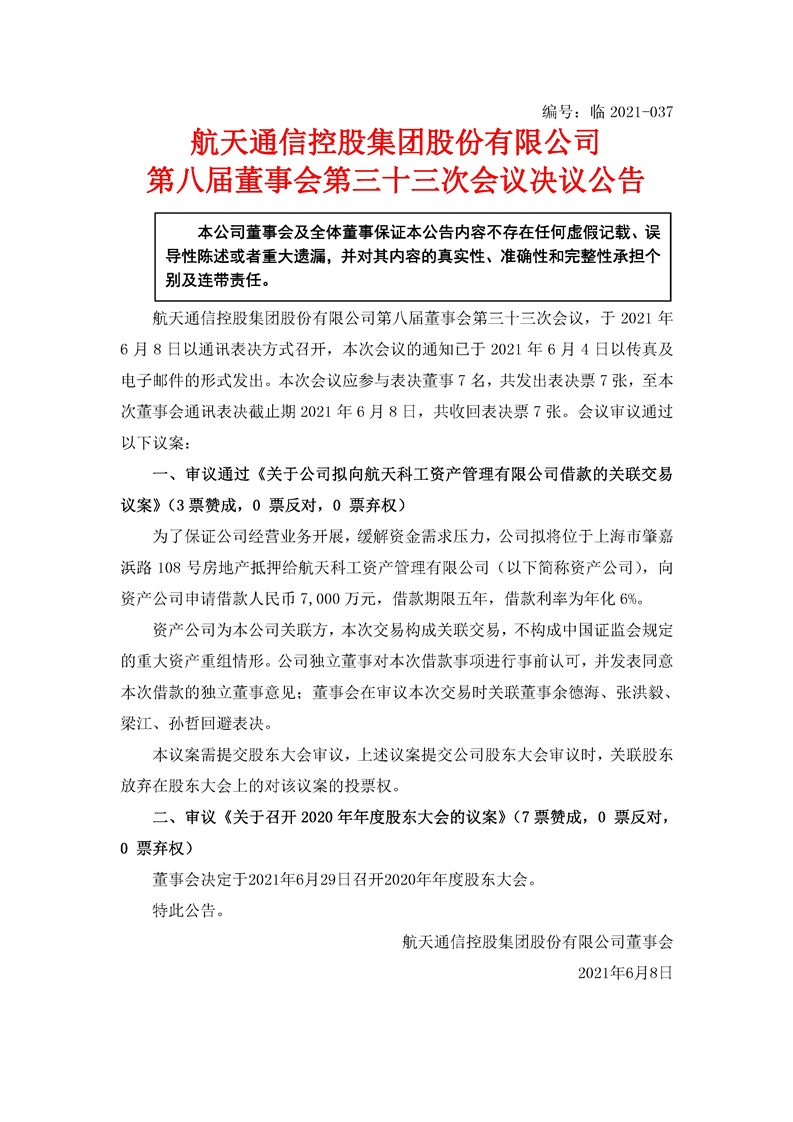 航天通信控股集團股份有限公司八屆三十三次董事會決議公告