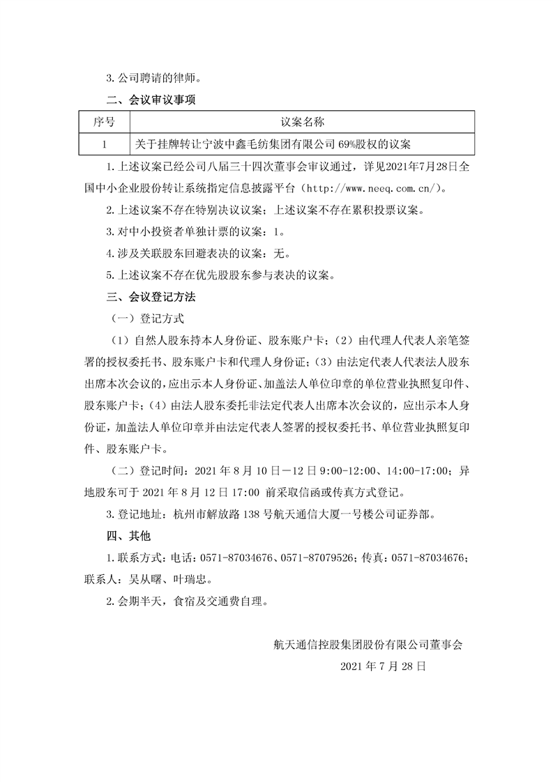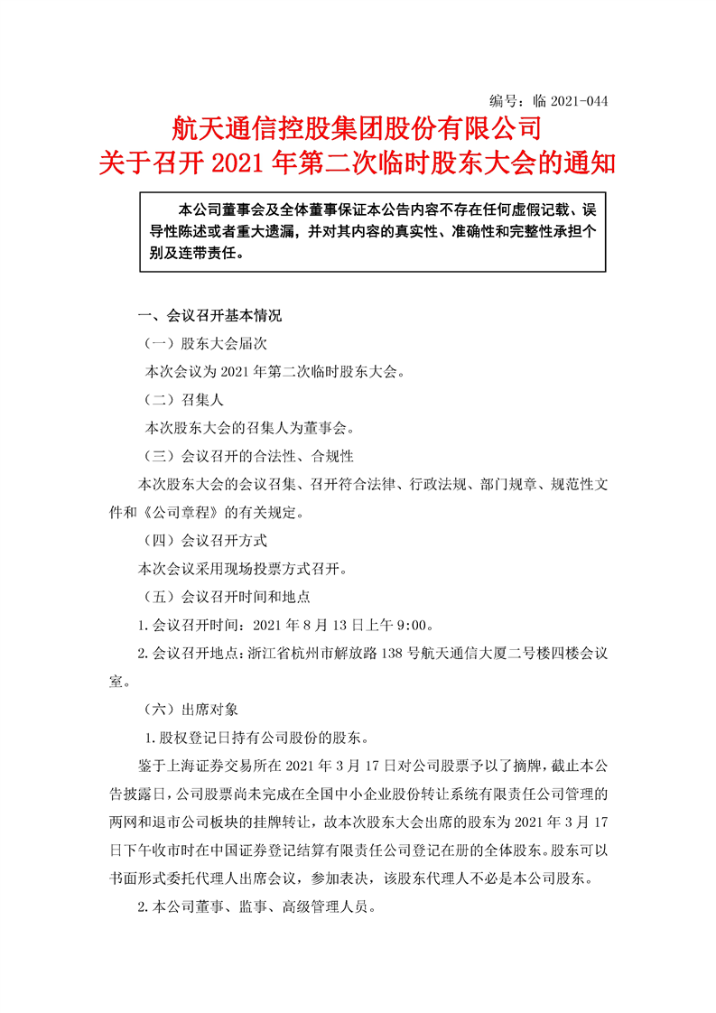 航天通信控股集團(tuán)股份有限公司關(guān)于召開2021年第二次臨時股東大會的通知