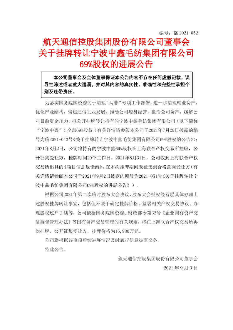 航天通信關(guān)于掛牌轉(zhuǎn)讓寧波中鑫毛紡集團有限公司69%股權(quán)的進展公告